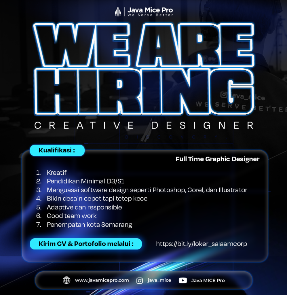 Kualifikasi Kreatif & Inovatif. Pendidikan Minimal D3/S1. Menguasai software design seperti Photoshop, Corel, dan Ilustrator. Bikin Desain cepet tapi tetep kece. Adaptive dan responsible. Good team work. Bersedia ditempatkan di Kota Semarang.
